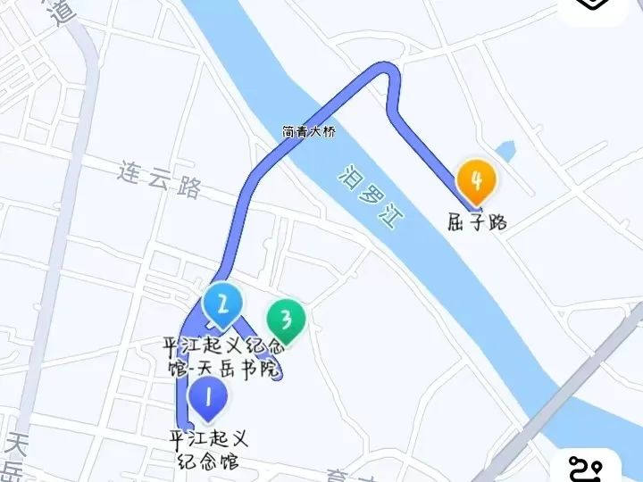 平江起义纪念馆 → 天岳书院 → 一中小吃一条街 → 简青大桥 → 大众沿江风光带。