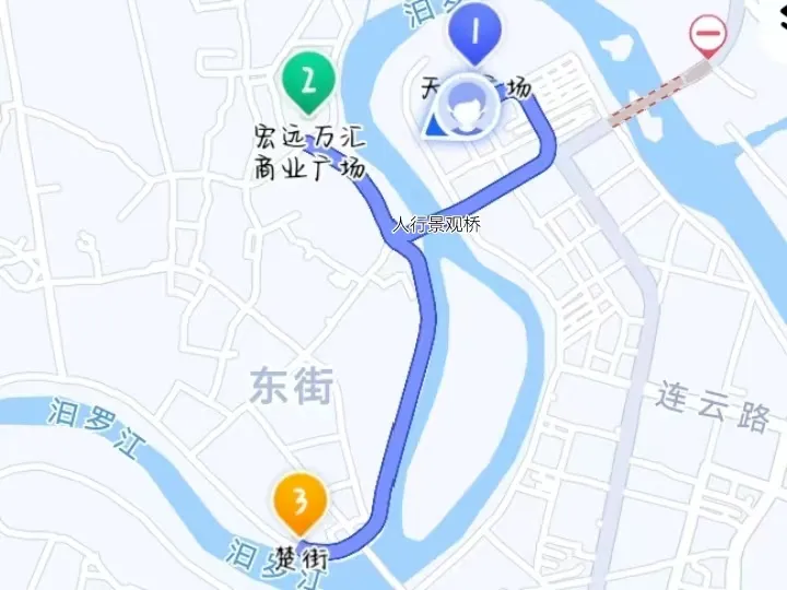天岳广场 → 人行景观桥 → 万汇商业中心 → 楚街夜市一条街。