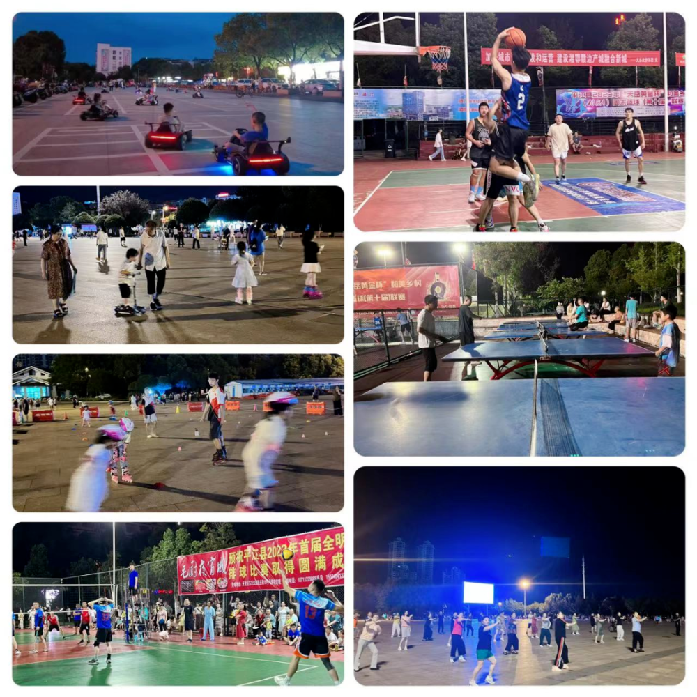 夜色下的天岳广场夜跑、滑板、广场舞、篮球、排球、羽毛球......。各项健身运动轮番登场、持续升温,“多巴胺”在此刻被唤醒,让人忍不住想参与其中。