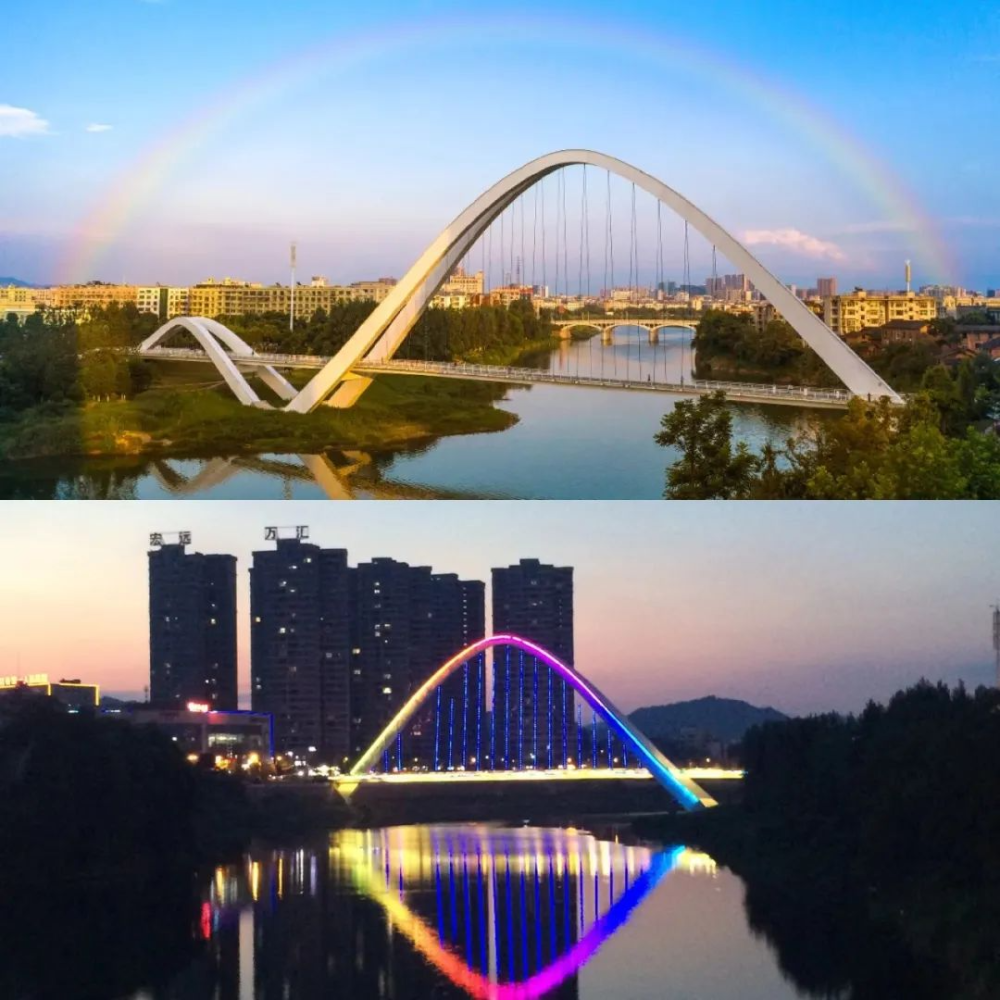 穿过天岳广场,在人行景观桥上散步。傍晚,华灯亮起,宛如一道架在汨水上的彩虹与江中倒影相映成趣。