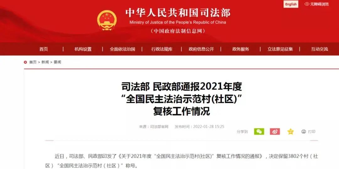 据悉,司法部、民政部自2004年在全国开展“民主法治示范村(社区)”创建以来,共命名了八批“全国民主法治示范村(社区)”,并每两年对“全国民主法治示范村(社区)”进行一次复核。我县的南江镇红门村、安定镇横冲村分别于2017年、 2020年获评该荣誉。