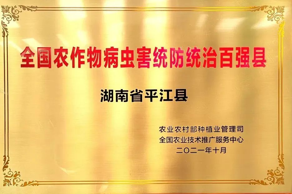 2021年10月,平江县还曾荣获“全国统防统治百强县”荣誉称号,这也是目前岳阳市唯一获得“双百强”的县市区。