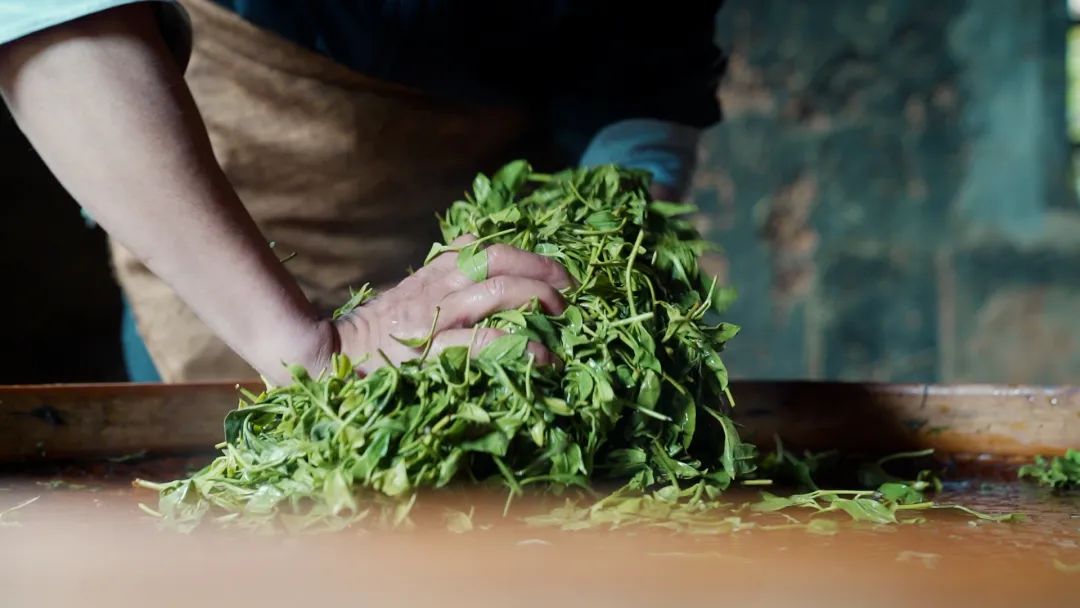 烟茶制作工艺古朴自然,炒青后揉制,老唐用手劲把叶汁一点点揉出来,偶尔也会选择用脚揉,更具力道,揉熟后茶汤经久耐泡。