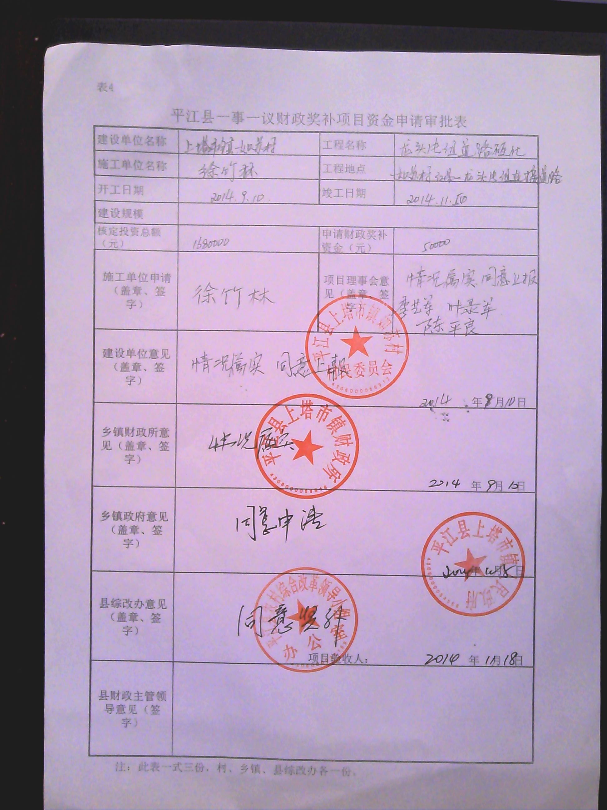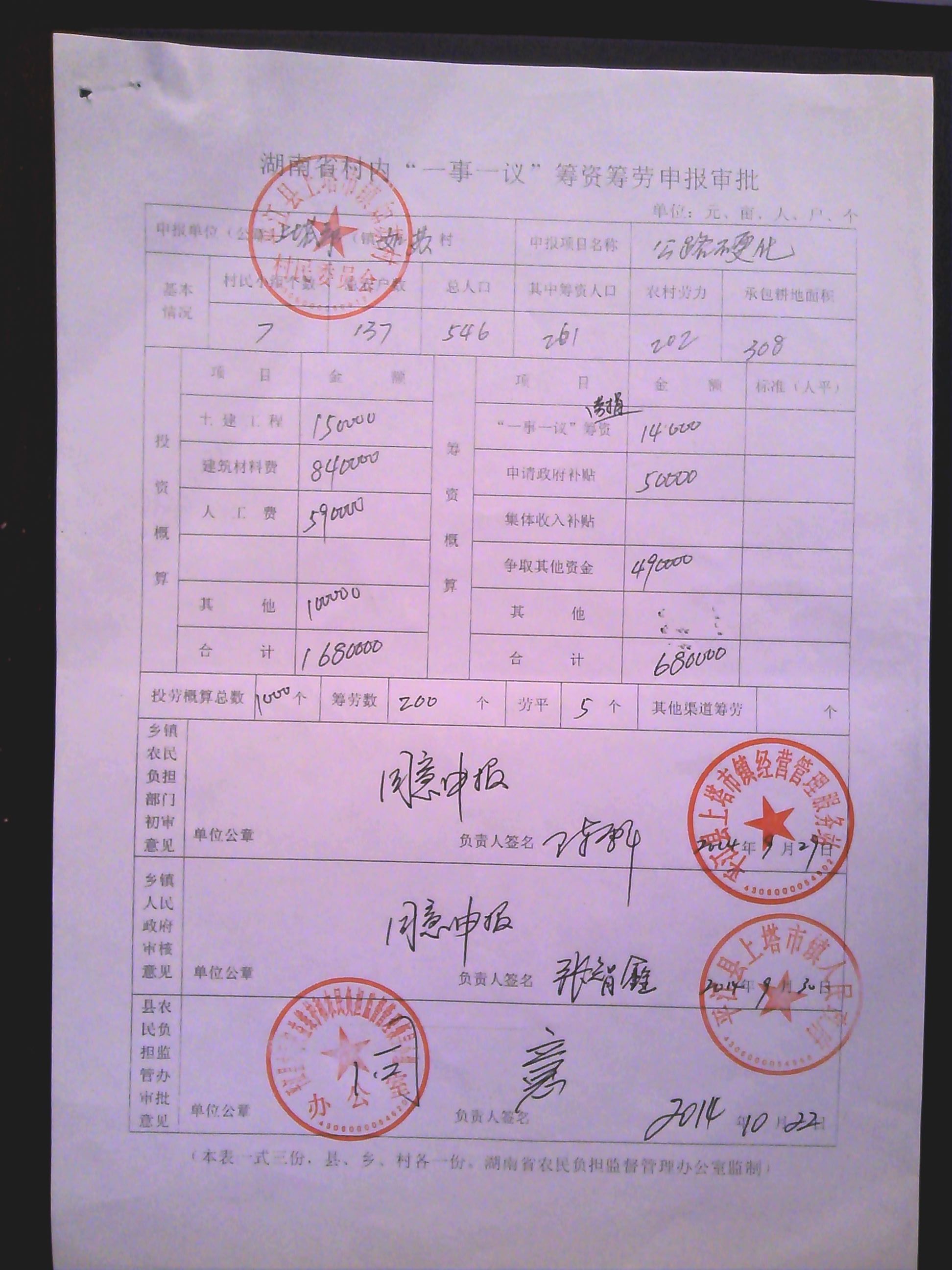 上塔市镇如苏村一事一议筹资筹劳申报审批