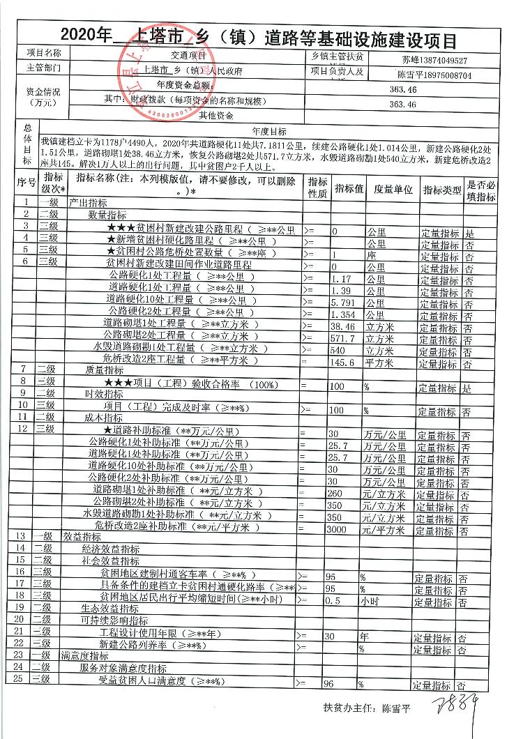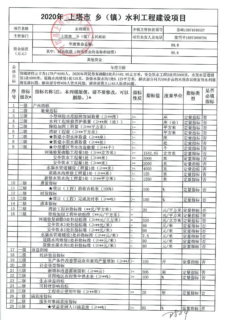 上塔市镇2020年统筹整合涉农资金项目库预算绩效申报