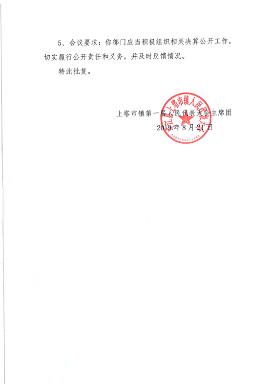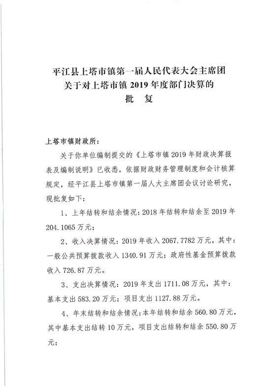 平江县上塔市镇第一届人民代表大会主席团关于对上塔市镇2019年度部门决算的批复