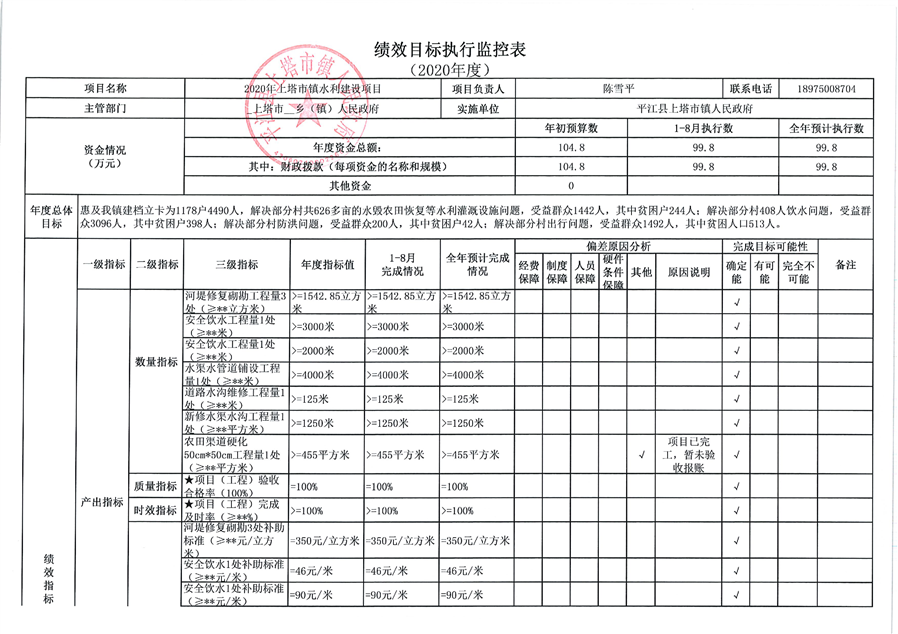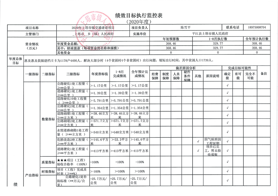 上塔市镇2020年统筹整合涉农资金项目库预算绩效监控