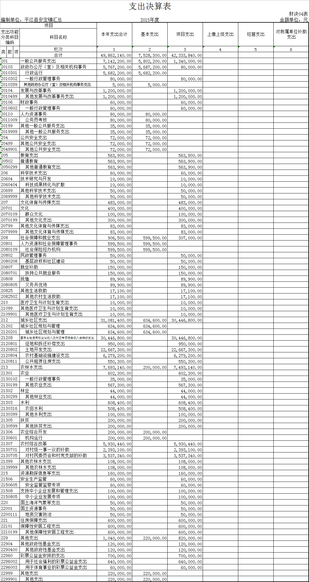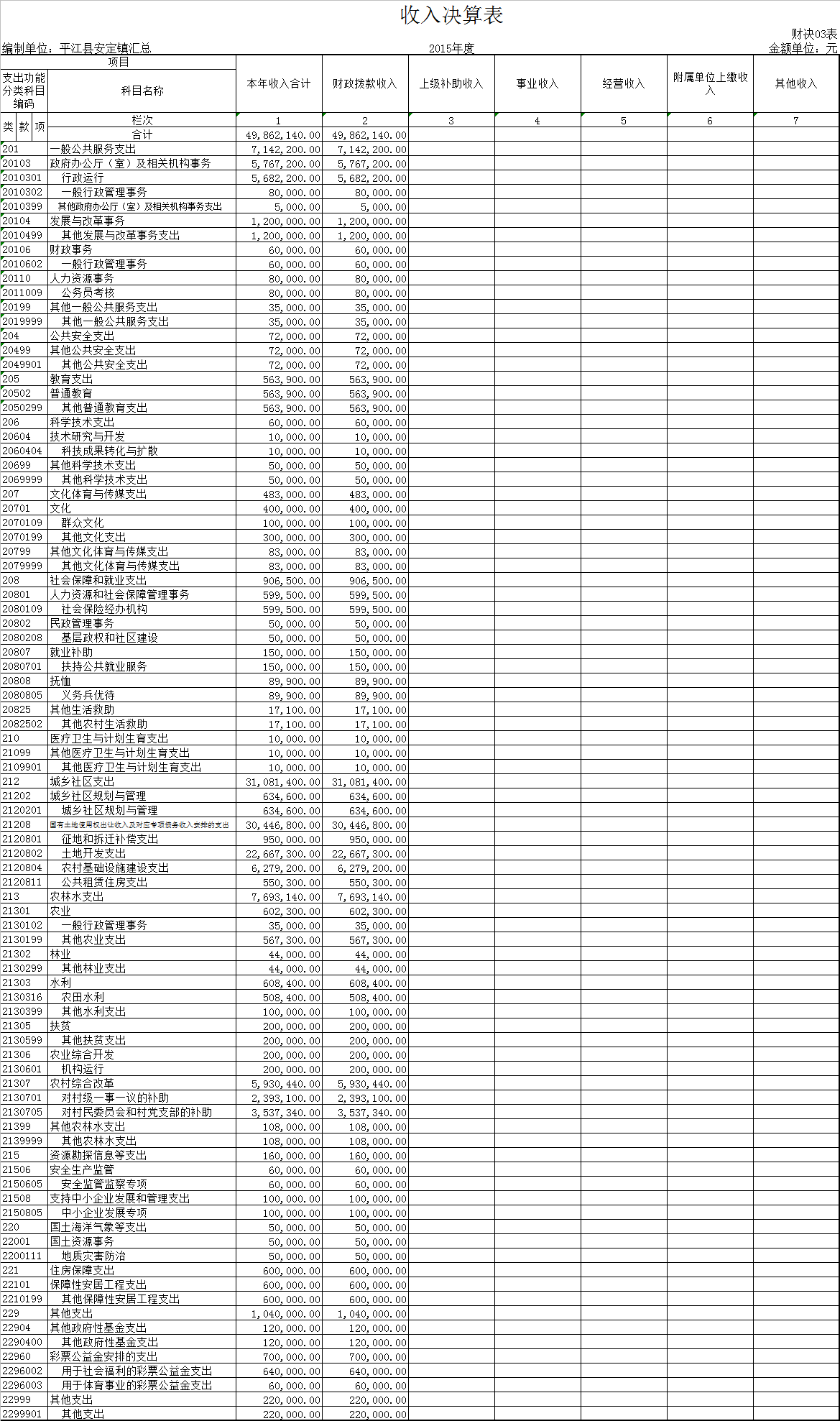 2015年安定镇行政汇总预算收入304.26万元,决算收入3939.3655 万元。汇总表全年共支出3939.3655万元,其中:基本支出 1010.56万元,项目支出2220.5855万元。
