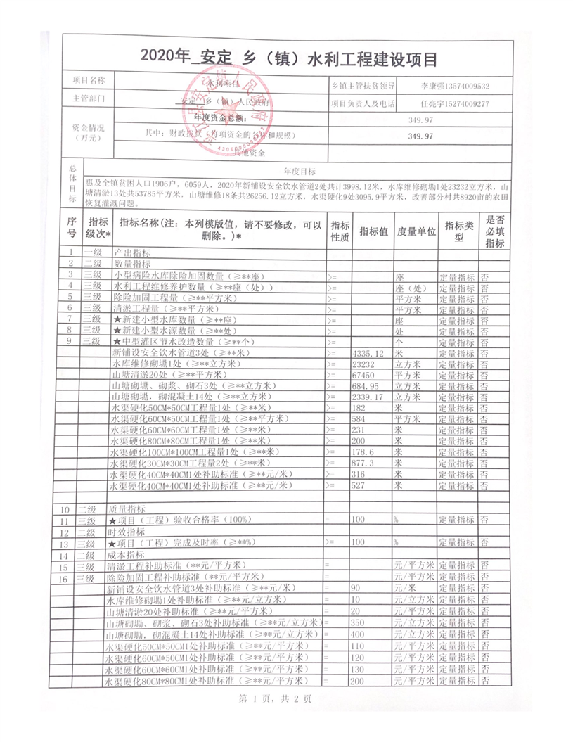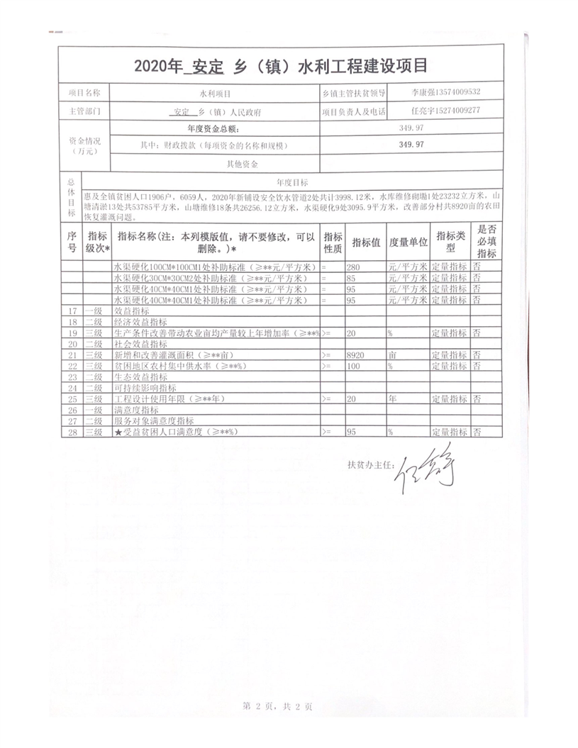 安定镇2020年统筹整合涉农资金项目库预算绩效申报(调整)