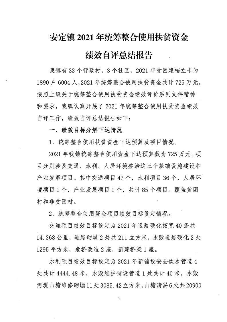 安定镇人民政府2021年度统筹整合使用财政涉农资金项目绩效自评报告