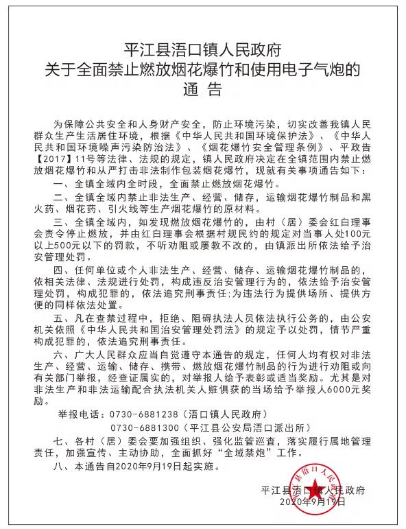 关于全面禁止染坊烟花爆竹和使用电子气炮的通告