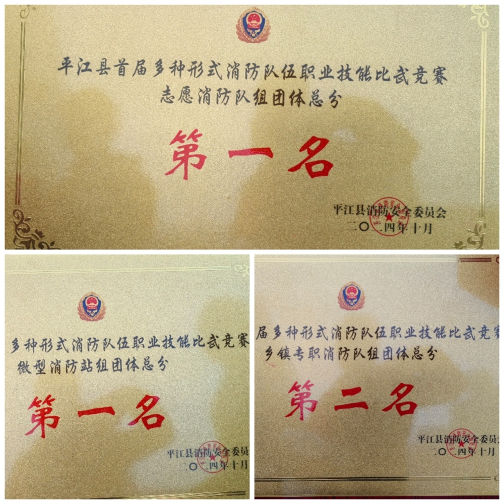 热烈祝贺浯口镇消防队伍荣获岳阳市多种形式消防比武竞赛原地着装灭油锅火操第一名,连接消火栓灭初期火灾操第三名,平江县多种形式消防队伍职业技能比武竞赛志愿消防队组团体总分第一名,微型消防站组团体总分第一名,乡镇专职消防队组团体总分第二名及多项个人荣誉。