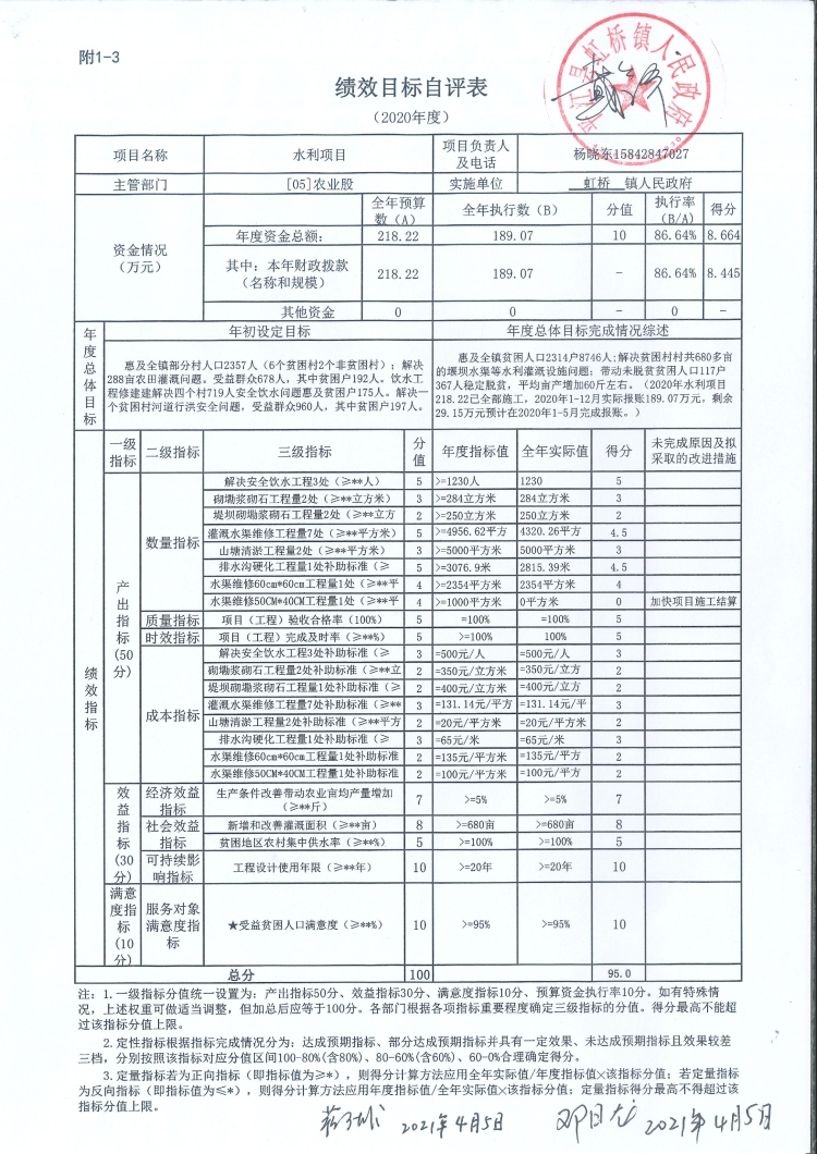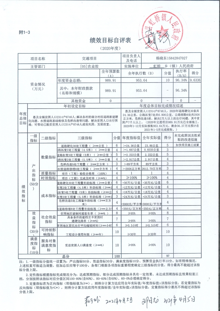 虹桥镇人民政府2020年财政专项扶贫资金绩效目标自评表