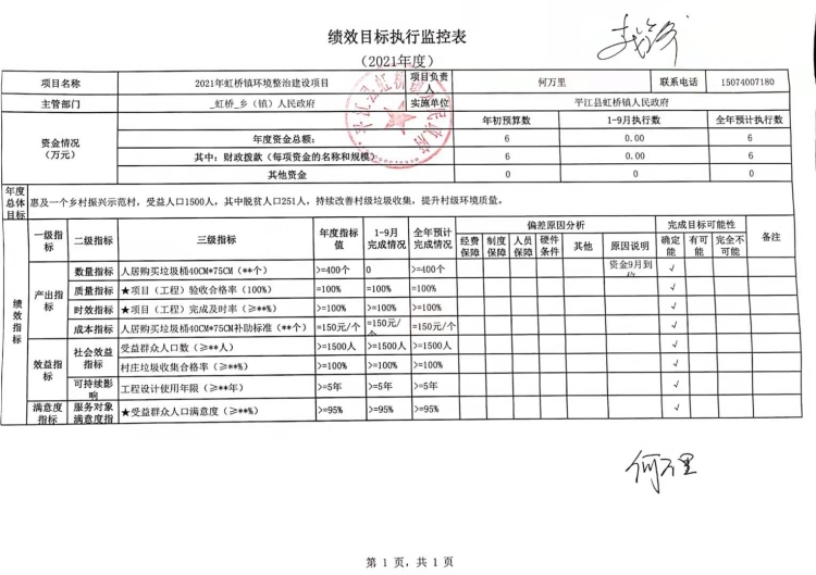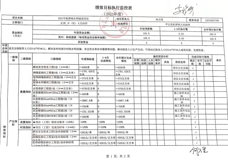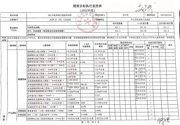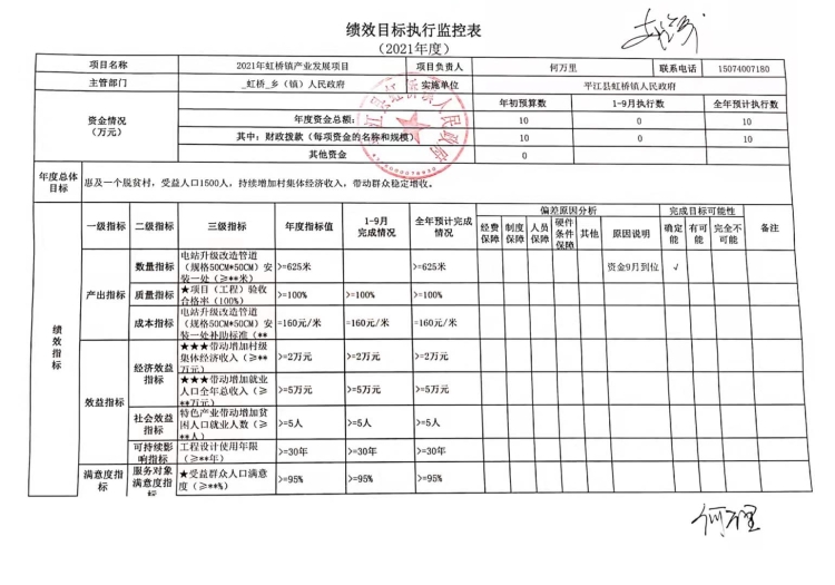 虹桥镇2021年度统筹整合财政涉农资金项目库绩效监控表