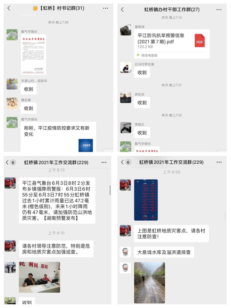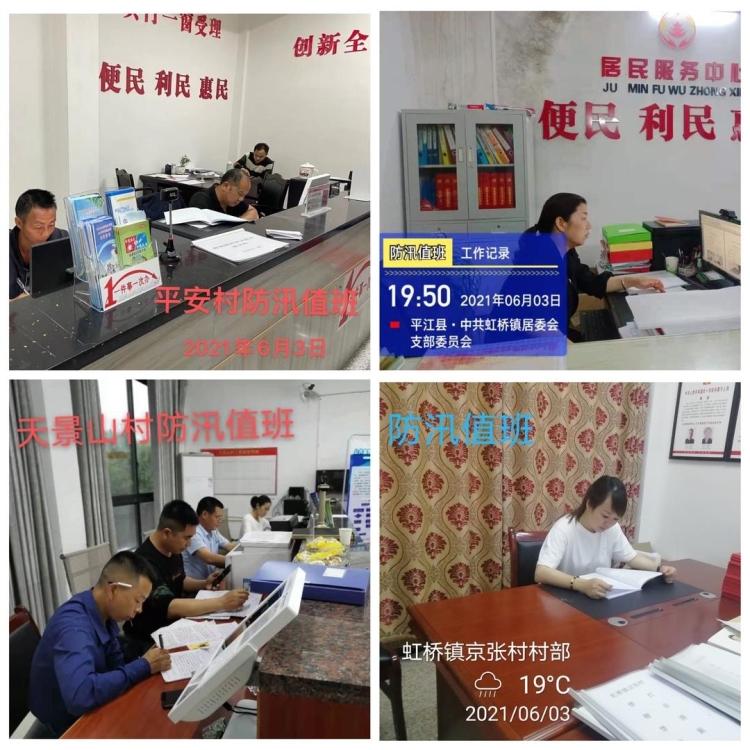 虹桥镇党委政府要求所有镇村干部必须认清当前的严峻形势,进一步提高政治站位,强化责任落实,坚决克服麻痹大意思想和侥幸心理。要求各村迅速行动,全力抓牢抓实防汛工作,要采用微信工作群转发、喇叭广播等各种宣传途径,广泛宣传防汛知识,做好群众思想工作,做到全民防汛。