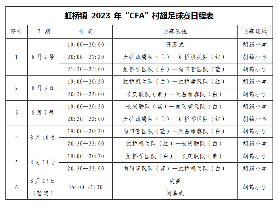 虹桥镇“CFA”村超足球赛的举办,旨在弘扬中国足球文化,传承竞技体育拼搏精神,增进各单位交流互动,增强凝聚力和战斗力,进一步营造全民健身浓厚氛围。