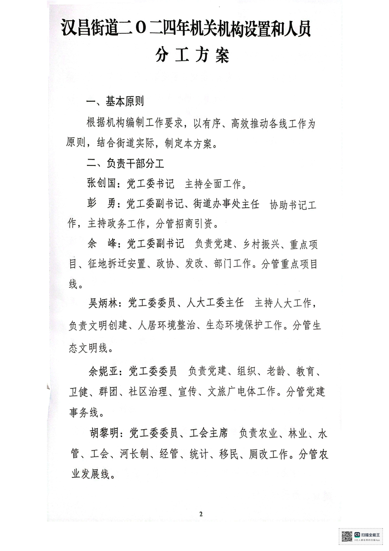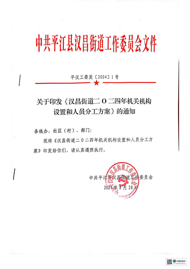 关于印发《汉昌街道二〇二四年机关机构设置和人员分工方案》的通知