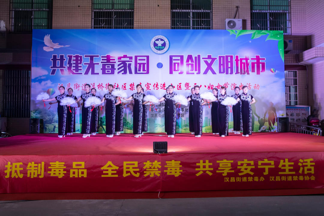 为全面加强禁毒宣传教育,切实提高广大居民群众的识毒防毒拒毒能力,营造全民禁毒的浓厚氛围。3月6日晚,由平江县禁毒办指导,汉昌街道办事处主办,汉昌街道浮桥街社区承办的"共建无毒家园 同创文明城市"禁毒宣传进小区暨三八妇女节演出活动在浮桥街便民服务中心举办。平江县禁毒办、禁毒协会、汉昌街道相关负责干部、31个村(社区)禁毒专干、部分社区戒毒康复人员代表和居民群众共计480余人参加。