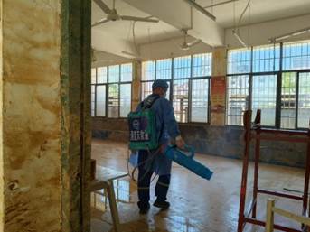 汉昌小学是此次洪灾的重灾区,当时一楼已全部被淹没。志愿者来到教室、食堂、器材室等十多间房屋内,逐一开展消杀,不放过任何一个角落。