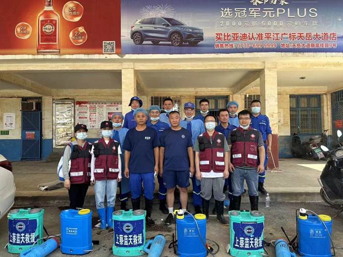 在灾后疫情防控中,这些志愿者队伍低调地穿行在各个受灾的角落,他们有的背着沉重的喷雾筒,有的拖着160公斤的消杀机,有的拉着数十米的消杀管,为守护人民群众的健康默默付出。为尽快全面消杀,他们甚至来不及将背负式喷雾筒放下,就直接由同伴打开盖子添加消毒水,加满又继续作业。这一幕幕一帧帧组合成了一幅幅健康守护图,感动着百万平江人。