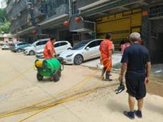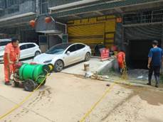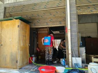 百花台社区牛车湾在此次洪灾中,很多居民地下室被淹没,且因积水需要抽出,退水较为缓慢,防疫任务更加紧迫。消杀志愿者迅速行动,深入各处地下室开展消杀。