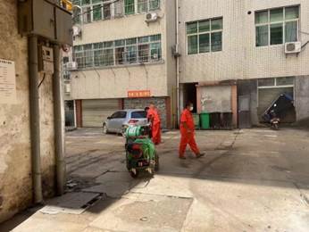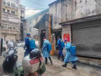 浮桥街社区和天岳广场面积大、背街小巷多、门店房屋密集、受灾严重,消杀任务十分繁重。志愿者们在高温环境下连轴作业,开展无死角消杀。