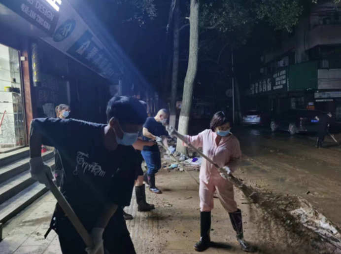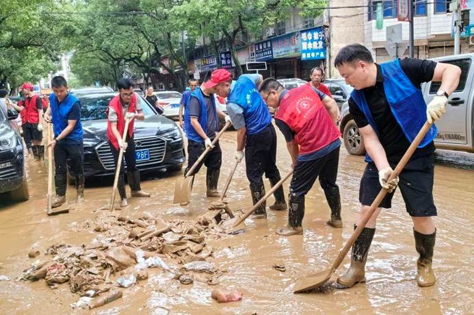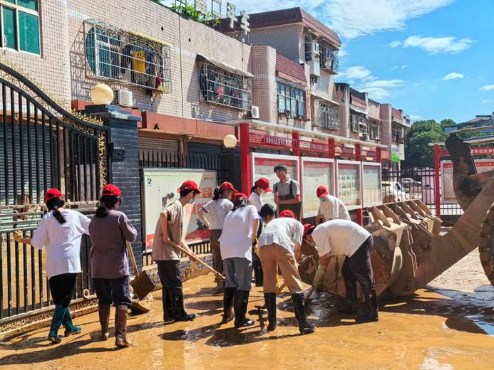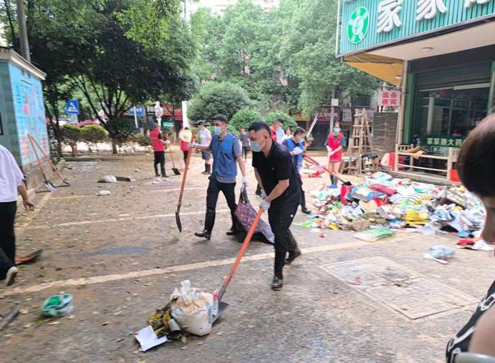 ▲7月6日,石牛寨镇干部90余人、井墈社区全体干部,支援坪上社区灾后重建,街面清淤及垃圾清理。