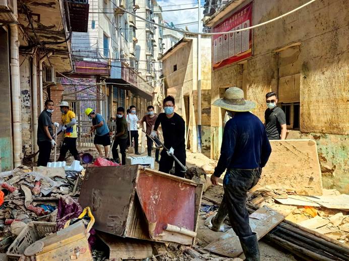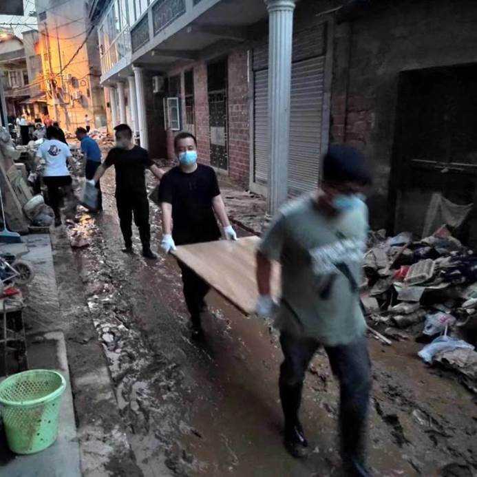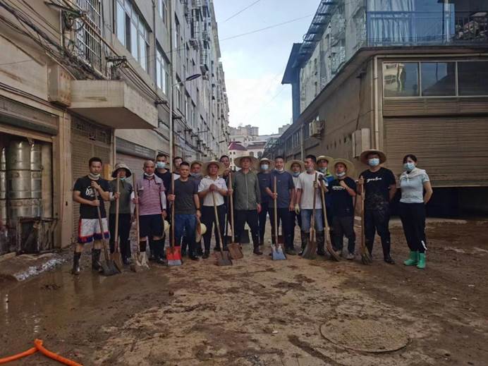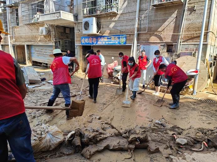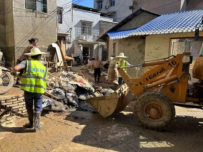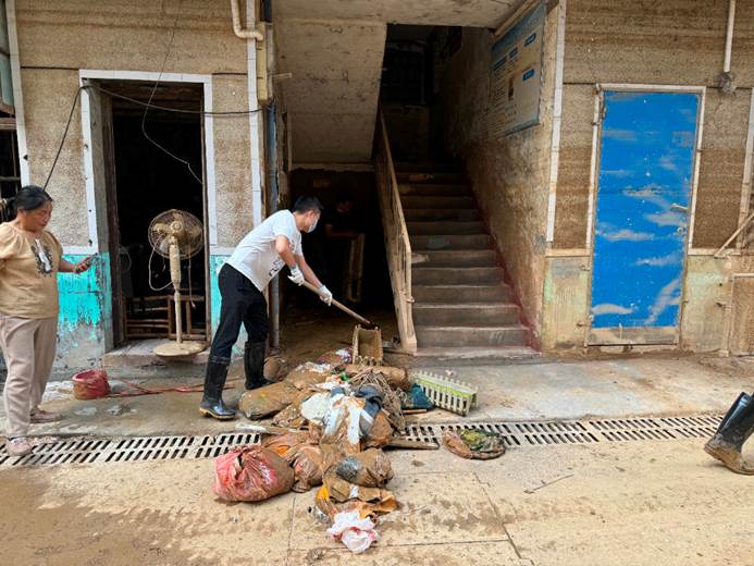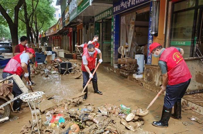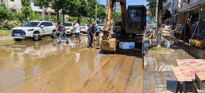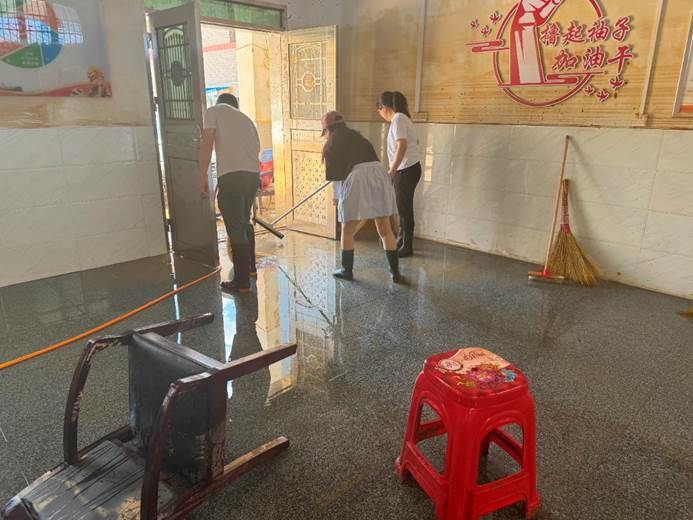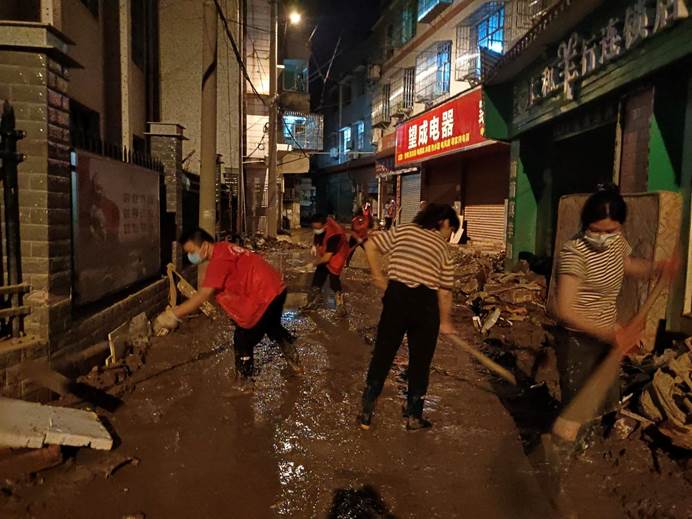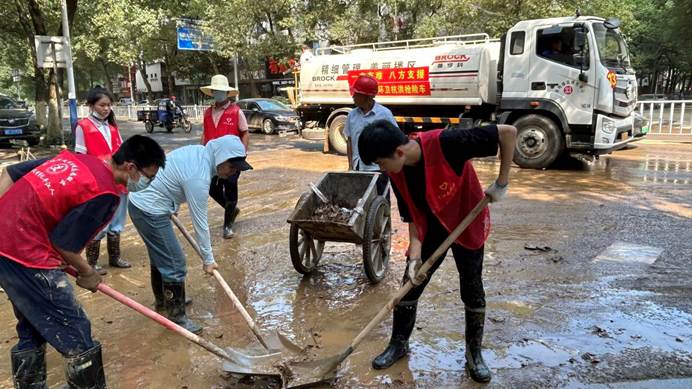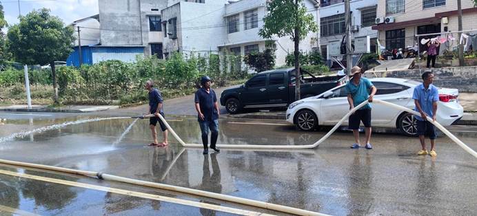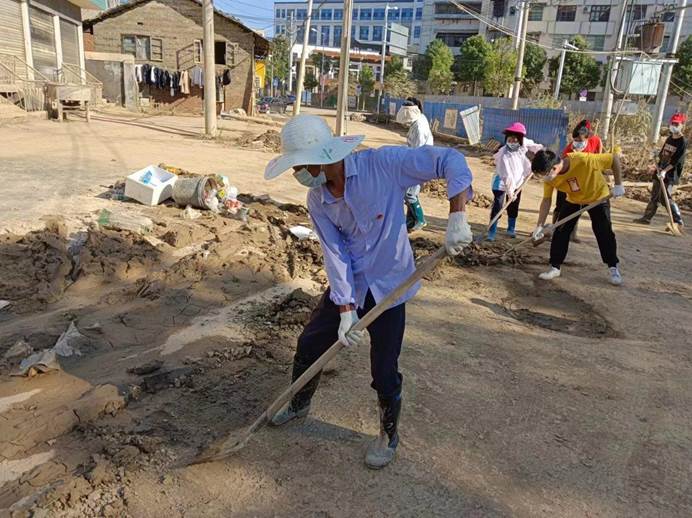 ▲7月6日,县各单位、县团委、兄弟村(迎瑞村,北附村、北城村、城坪村村)支援浮桥街社区灾后重建,清淤冲洗路面。