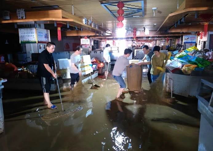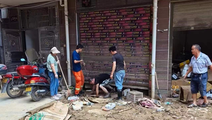 ▲县发改局组织全局党员干部职工在老车站(天宝宾馆——老大桥)路段协助沿线商户开展汛后清淤工作。