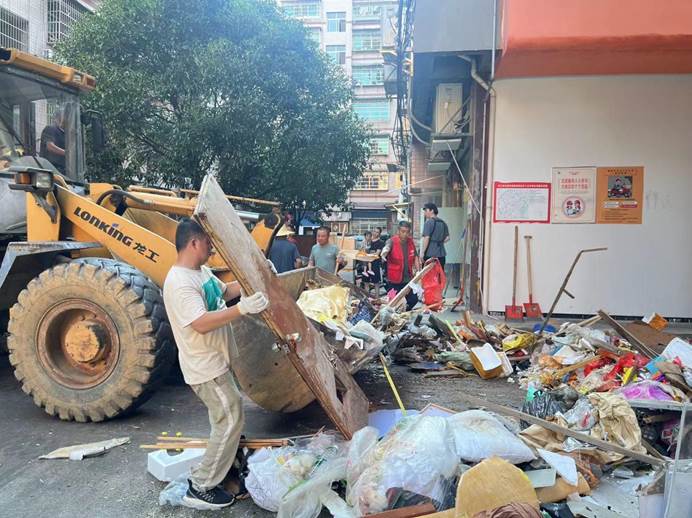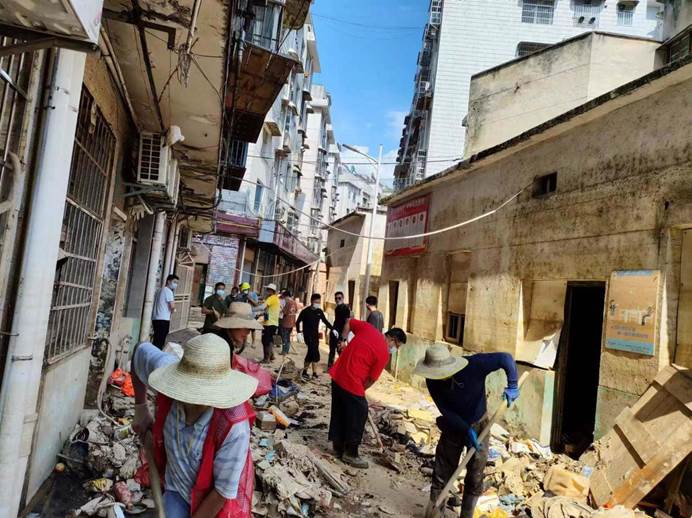 ▲县委编办组织机关党员干部在启明社区开展隐患排查、清淤行动。