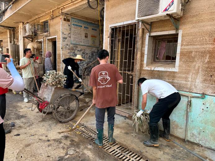 ▲7月6日晚,城东村全员上岗,开展垃圾杂物清理及路面清淤。