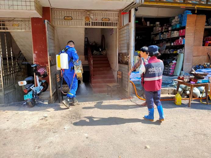 ▲县第四人民医院派出10名医务人员深入小区、车库、沿路铺面共43处指导汛后防疫消杀,并进行防疫防病知识宣传。