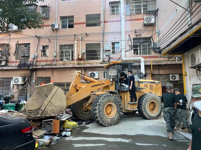 ▲7月7日下午,童家岭社区副书记联络武警官兵30人,铲车3台,渣土车3台,继续对辖区升坪网格清淤及垃圾杂物清理。