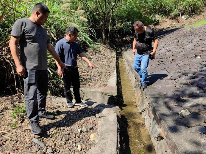 ▲街道党工委张书记到各个农业村实地查看塌方点位、损毁渠道,并现场对接各部门单位商讨抢修方案。