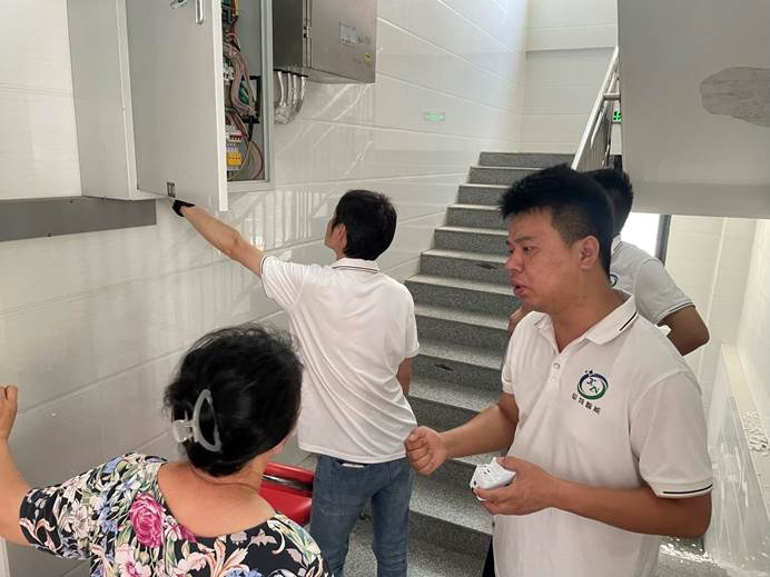 ▲岳阳市军特智能公司到百花台社区免费帮居民安装智能浸水防触电保护器。