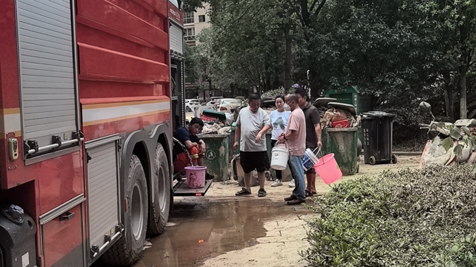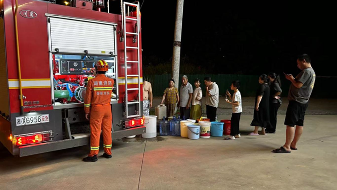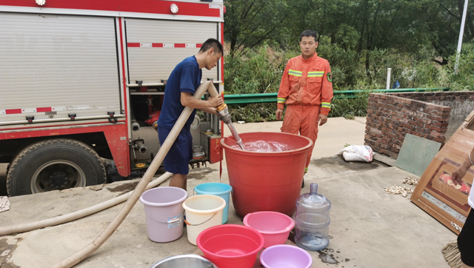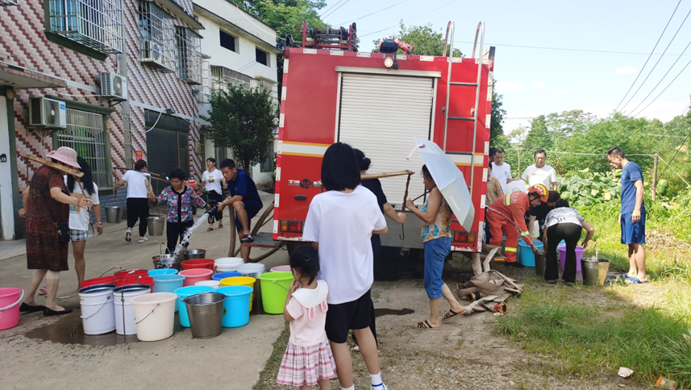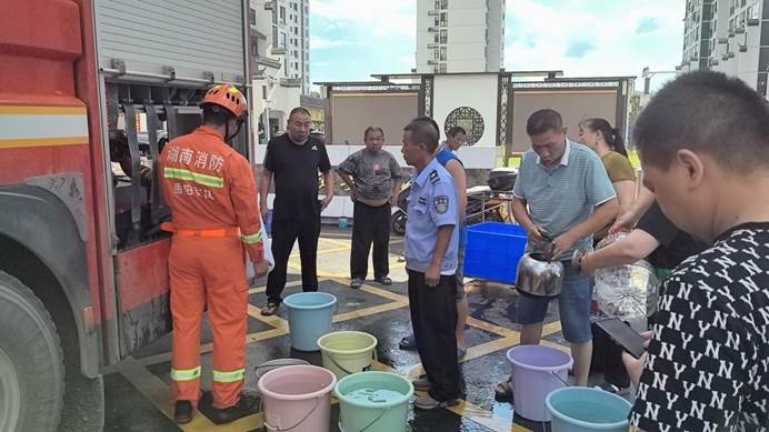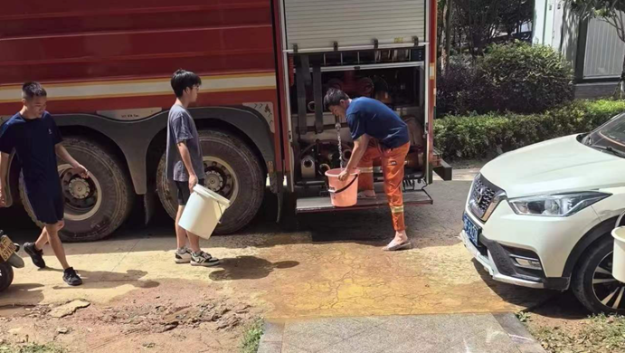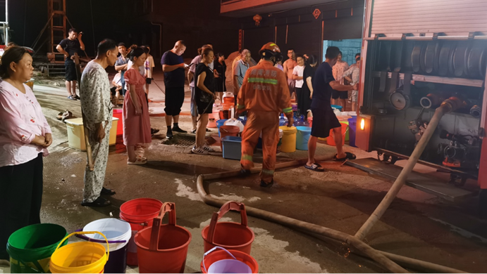 ▲街道童领江主任联合消防队,昼夜不停为受灾群众提供生活保障用水。