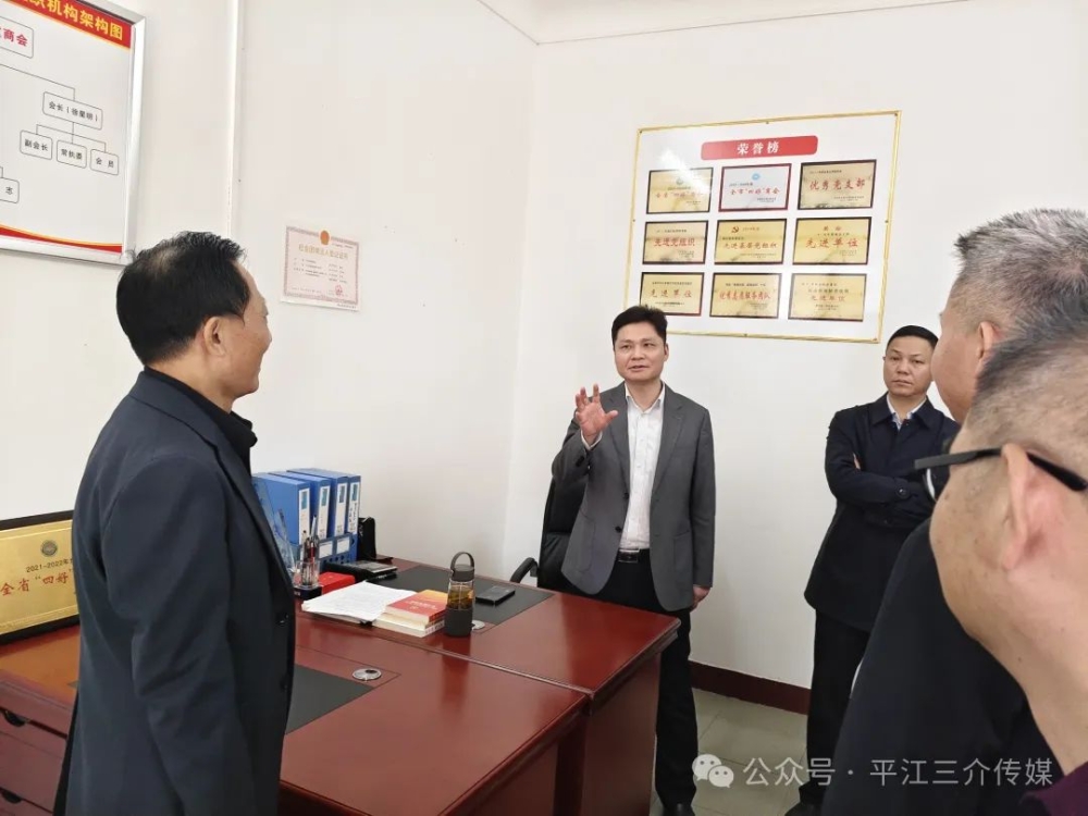 10月30日上午,岳阳市委社会工作部部长、“两新”工委书记杨林彬,市委社会工作部副部长傅耀华一行,在平江县委副书记、统战部部长鲁勇,县委社会工作部部长张文,县委社会工作部副部长江大庆,汉昌街道党工委副书记、办事处主任彭勇的陪同下,莅临平江县汉昌街道商会调研指导工作。