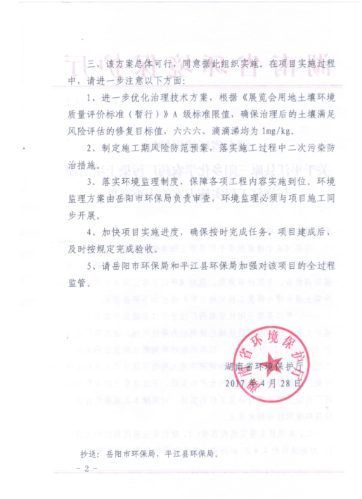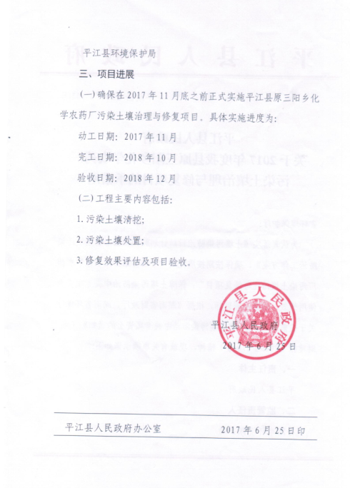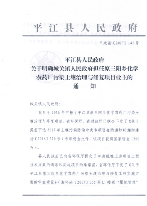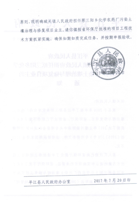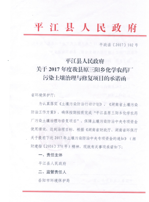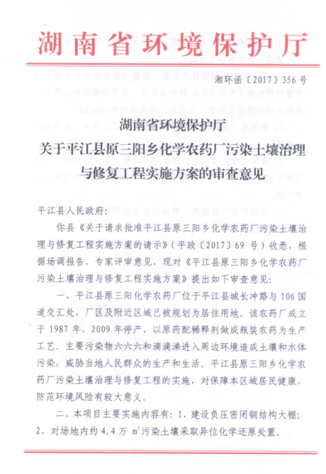 关于平江县原三阳乡化学农药厂污染土壤治理与修复工程实施方案的审查意见