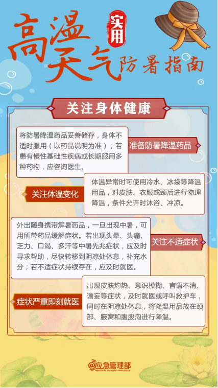 为帮助大家科学应对高温天气,有效预防中暑,特附上由应急管理部发布的《高温天气实用防暑指南》,一起学习防暑知识,守护身心健康: