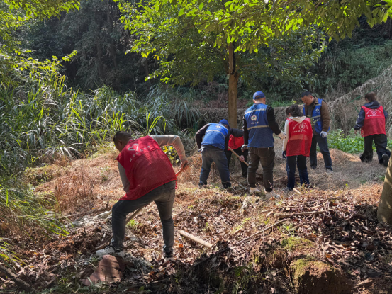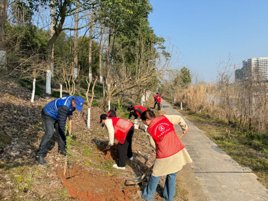 在县新时代文明实践中心的指导与街道统一部署下,400余名参与者化身“红马甲”志愿者,挽袖持锹,奔赴汨罗江沿岸、社区闲置地块及荒山坡等预先勘选的区域。现场分工有序:挖坑者挥锹破土,扶苗者悉心安置,填土者覆土夯实,浇水者往来奔波。汗水浸湿鬓发,笑意盈满眼眶——这抹“志愿红”与破土新绿交织,构成了春日里最为动人的风景。