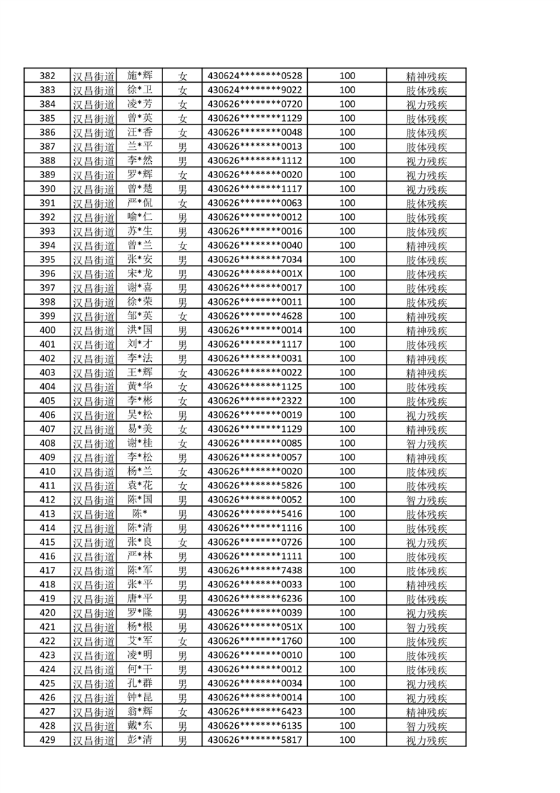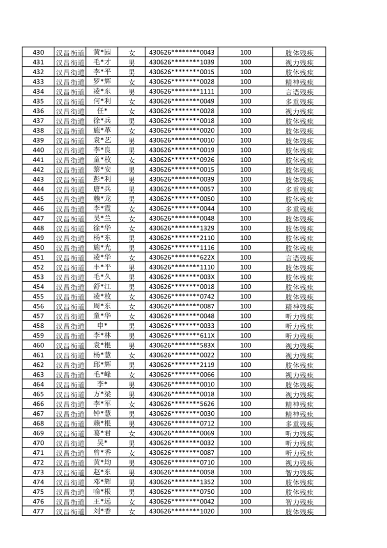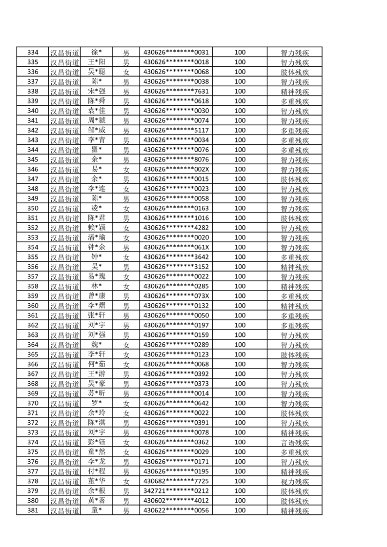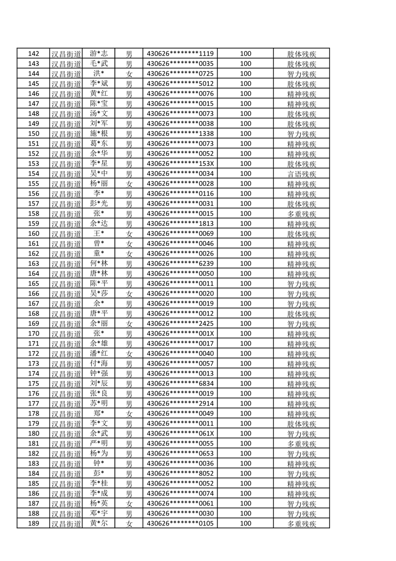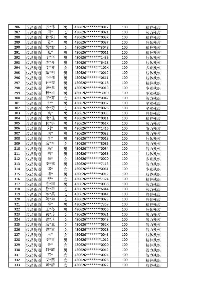 汉昌街道2025年10月份困难残疾人生活补贴发放名册