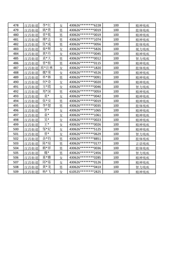 汉昌街道2025年11月份困难残疾人生活补贴发放名册