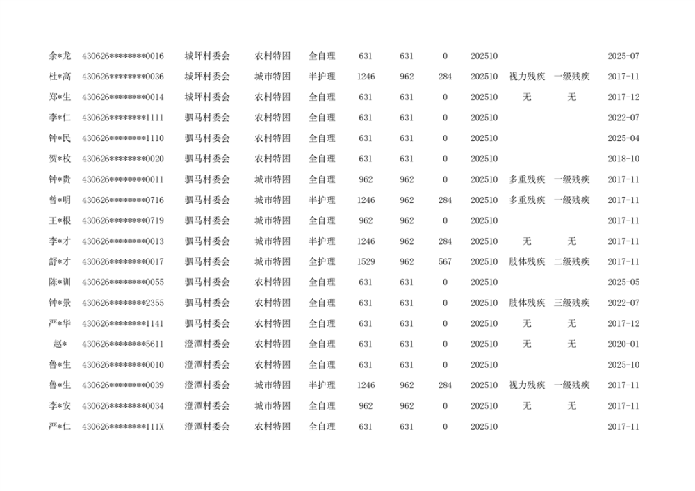 汉昌街道2025年11月分散特困人员花名册