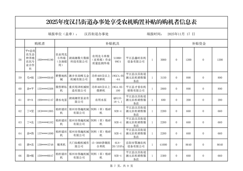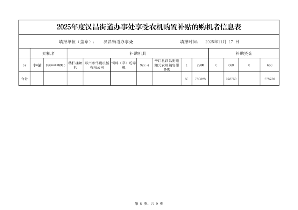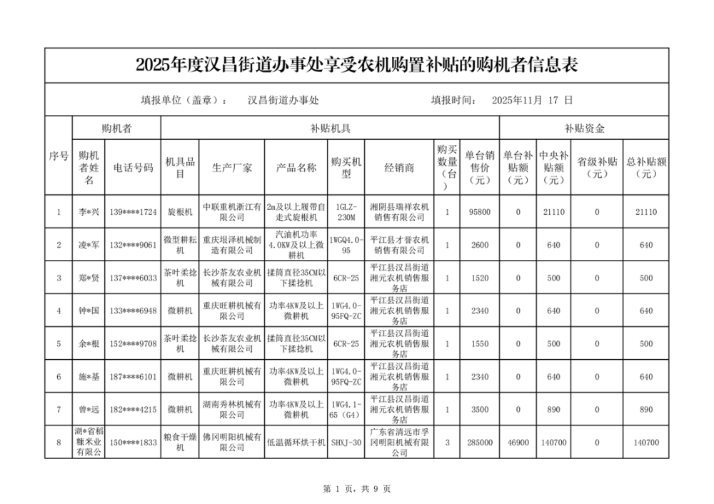 2025年度汉昌街道办事处享受农机购置补贴的购机者公示