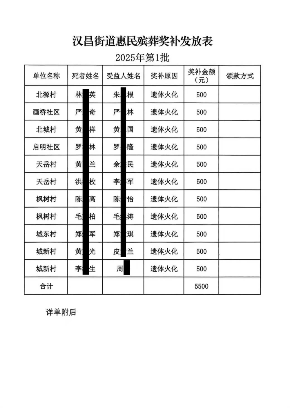 汉昌街道惠民殡葬奖补发放表 2025年第1批