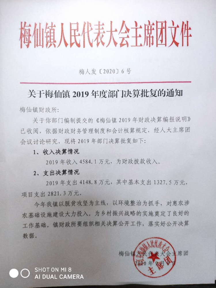 梅仙镇2019年部门决算批复通知
