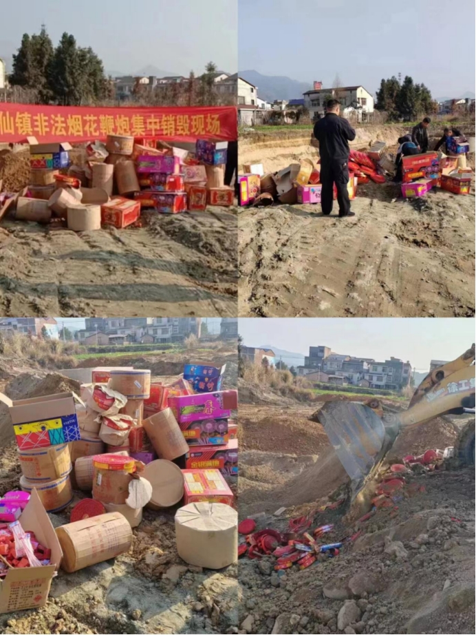 在专项行动中,副镇长孔振华组织应急办、执法大队等部门对梅仙、柘庄、团山三个集镇店铺开展“地毯式”巡查,并在关键交通路口不定期设卡排查,对排查出的烟花鞭炮一律收缴并集中销毁。