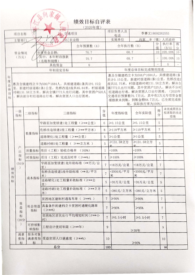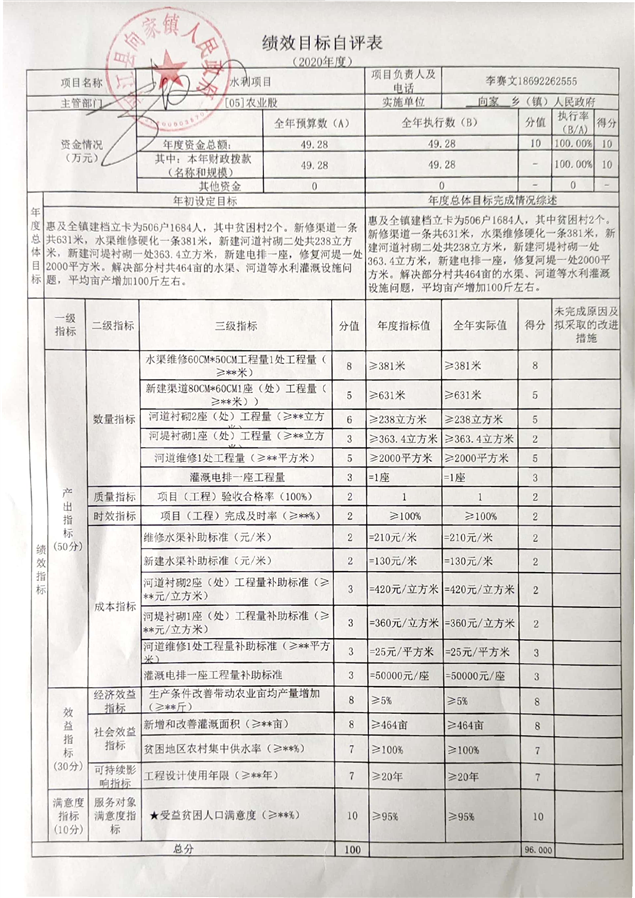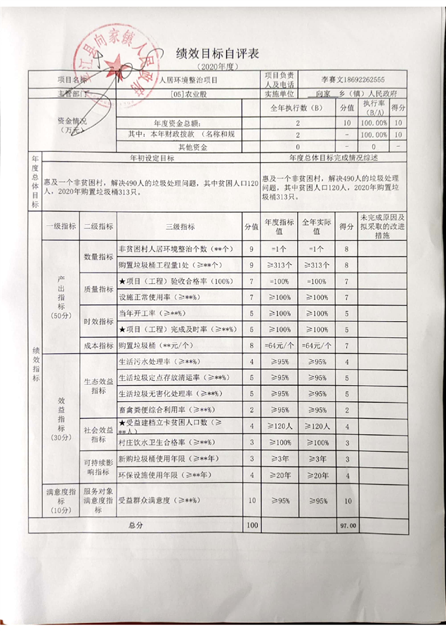 向家镇人民政府2020年财政专项扶贫资金绩效目标自评表