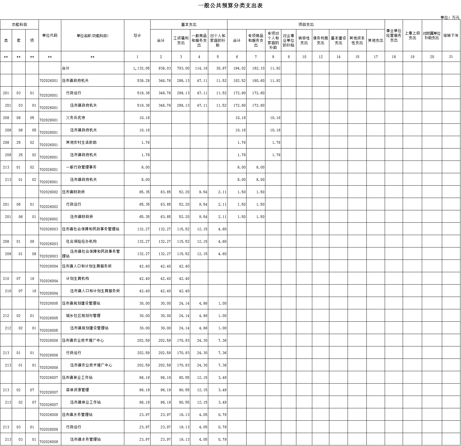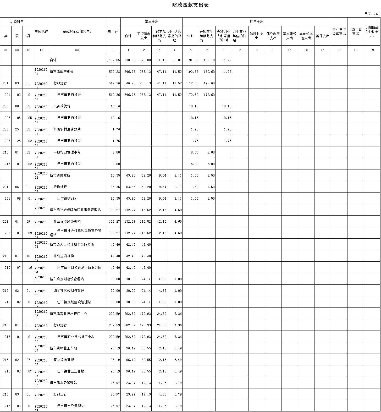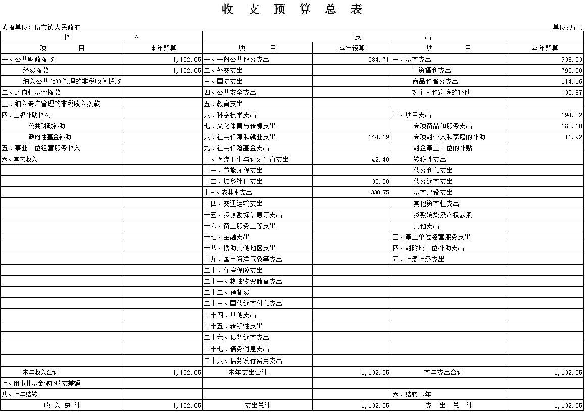 全年财政总支出1132.05万元。其中政府经费支出346.76(包括工资115.21万元、津补贴105.54万元、奖金9.6万元、社会保障缴费57.78万元、办公费20万元、印刷费1万元、水费5万元、电费4.18万元、差旅费1.38万元、会议费5.19万元、工会经费2.3万元、培训费1.15万元、福利费6.91万元、住房公积金11.52万元、基层统计达标0.5万元、均衡性公用经费92.1万元、农场体制改革10万元、农村税费改革8万元、社会综合管理费用21.8万元、五保供养配套经费41.7万元、乡镇工会团委妇联工作经费6万元、乡镇三馆免费开放配套经费0.5万元),财政经费支出63.85万元(包括工资21.06万元、津补贴19.88万元、奖金1.76万元、社会保障缴费9.5万元、办公费3万元、会议费0.96万元、电费2万元、差旅费1.69万元、工会经费0.42万元、培训费0.21万元、福利费1.26万元、住房公积金2.11万元),社保经费支出132.27万元(包括工资46.02万元、津补贴42.35万元、奖金3.84万元、绩效工资1.64万元、社会保障缴费21.67万元、办公费3万元、水费0.5万元、电费2万元、差旅费0.44万元、会议费2.07万、培训费0.46万、工会经费0.92万、福利费2.76万、住房公积金4.6万),人口与计生经费支出42.4(包括工资18.31万元、津补贴2.64万元、绩效工资12.98万元、社会保障缴费8.47万元),城建经费支出30万(包括工资10.03万元、津补贴3.27万元、奖金0.84万元、绩效工资5.38万元、社会保障缴费4.62万元、办公费1.51万元、水费1万元、电费1万元、会议费0.45万、工会经费0.2万、培训费0.1万、福利费0.6万、住房公积金1万)。农技经费支出202.59(包括工资73.65万元、津补贴13.3万元、奖金6.14万元、绩效工资45.26万元、社会保障缴费32.58万元、办公费4万元、水费3万元、电费3.67万元、差旅费3万元、会议费4万、工会经费1.47万、培训费0.74万、福利费4.42万、住房公积金7.36万)。林业经费支出96.19(包括工资34.87万元、津补贴6.22万元、奖金2.91万元、绩效工资21.23万元、社会保障缴费15.32万元、办公费3万元、印刷费2万元、水费0.44万元、电费2万元、会议费1.57万、工会经费0.7万、培训费0.35万、福利费2.09万、住房公积金3.49万)。水利经费支出23.97万元(包括工资7.86万元、津补贴3.11万元、奖金0.65万元、绩效工资3.86万元、社会保障缴费3.65万元、办公费1万元、水费0.99万元、电费1万元、会议费0.36万、工会经费0.15万、培训费0.08万、福利费0.47万、住房公积金0.79万)。项目支出预算合计194.02万元。