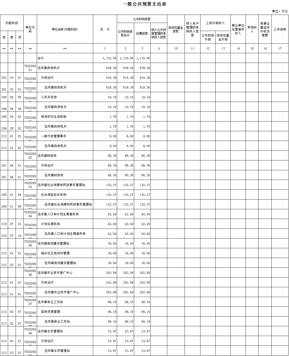 全年财政经费拨款1132.05万元。其中行政经费拨款539.28万、财政经费65.35万元、水利经费23.97万元、社保132.27万元、人口计生经费42.4万元、农技经费202.59万元、林业经费96.19万元、建管经费30万元。